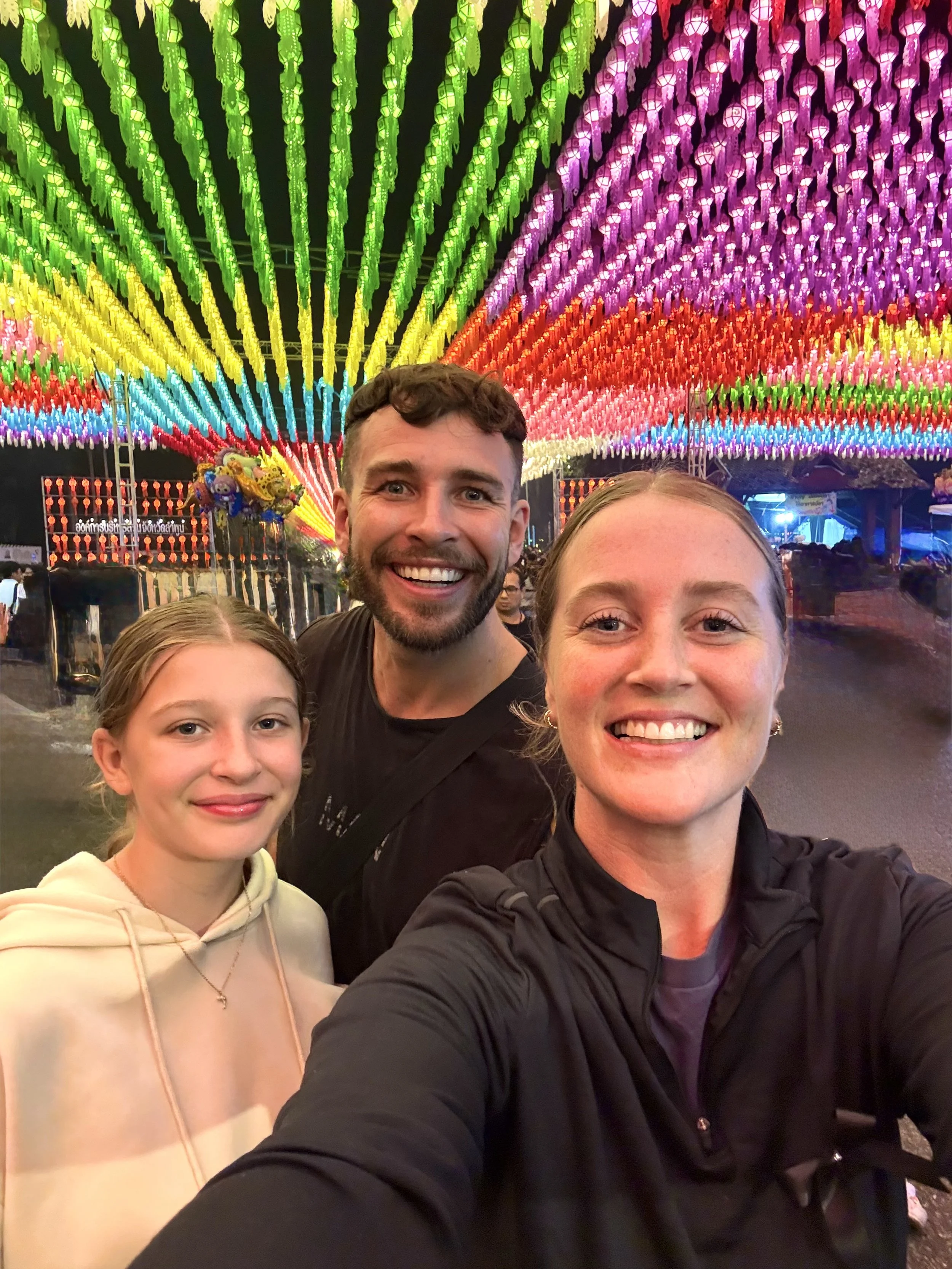 The entire town was glowing — hundreds of colourful lanterns hung across streets and temples, while locals released floating krathongs down the river to let go of past energies and make wishes for the future.